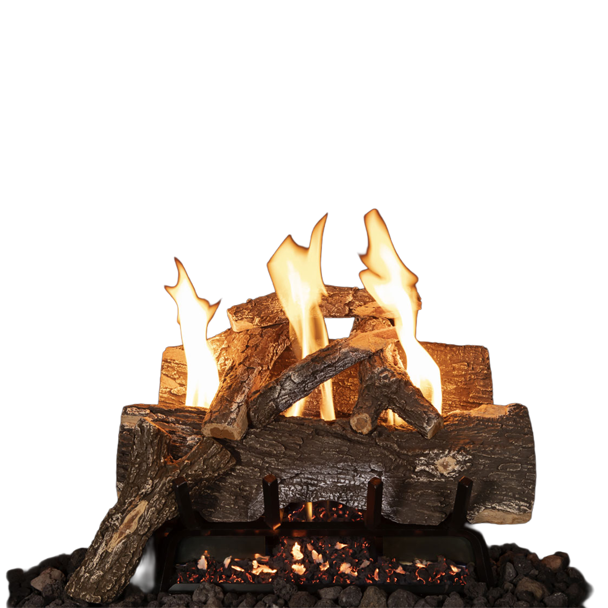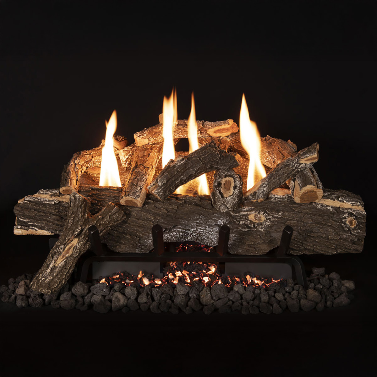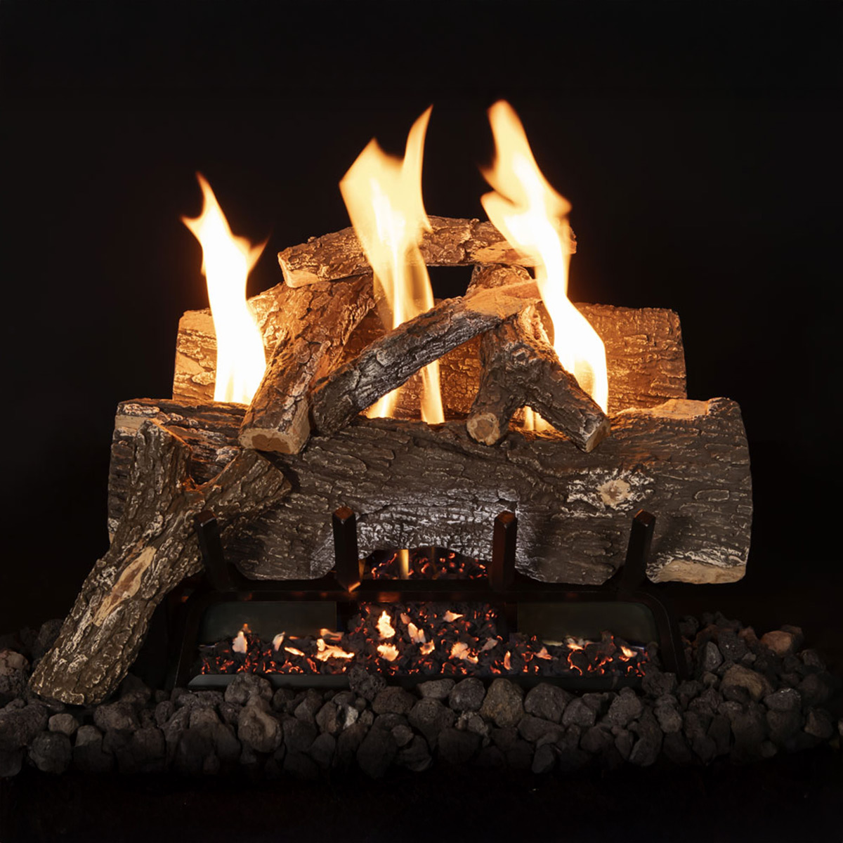 The burner is also duly listed for vented & vent less applications. The valve systems feature an exceptional turn down from 37K–19K BTU’s on the electronic & variable valves. The grate also features a natural wood style looking grate, enhanced deep ember bed & large lava rock to soften the embers edge. The 18” burner is available with our 18” logs & the 24” burner can be installed with 24” or 30” logs. The boutique style logs are available in Weathered Oak, Red Oak, Split Oak or Aspen Birch. All of our logs are hand picked, hand painted & feature a ceramic refractory to help radiate more heat.